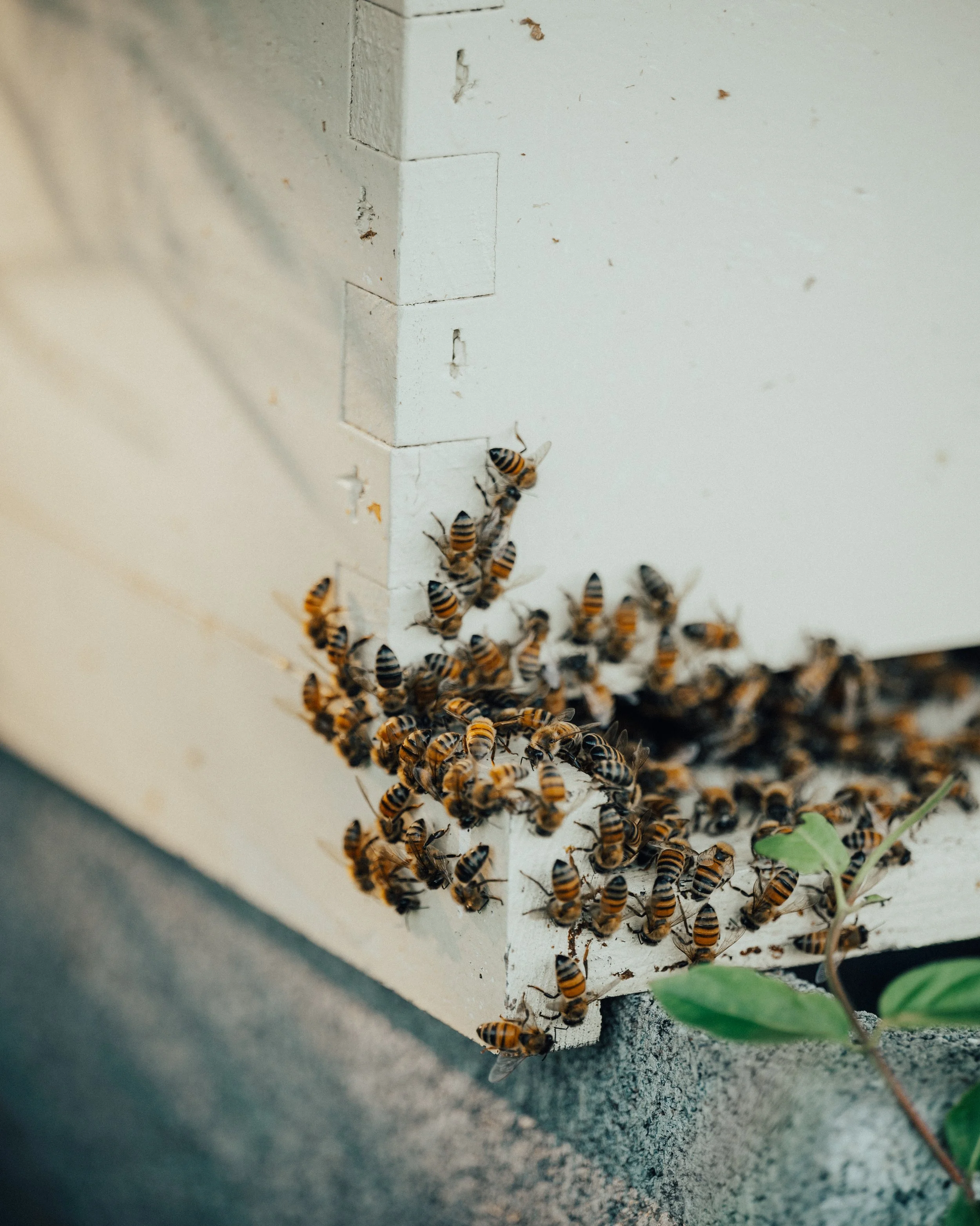 Honeybees bearding on the hive after returning from spring exploratory flights in search of pollen.