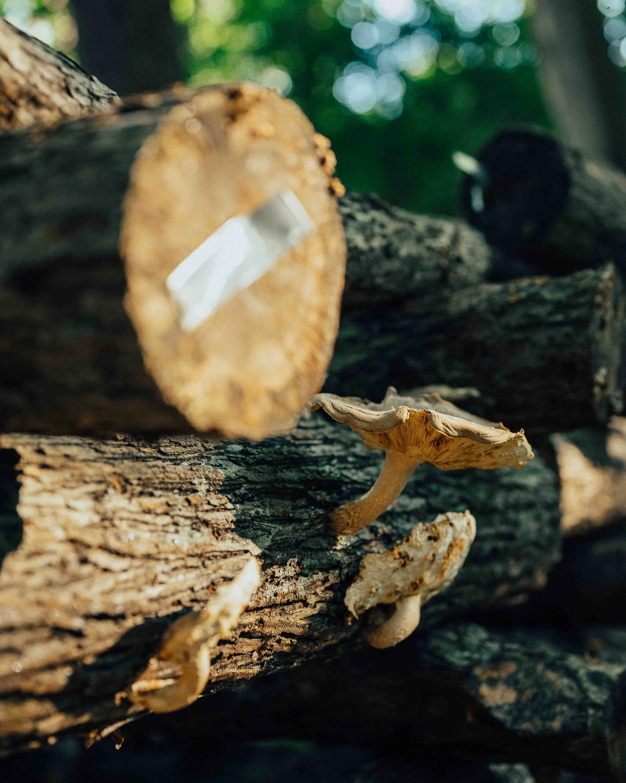 Shiitake mushrooms grown on hardwood logs in the woods alongside a stream at Burnt Hill Farm.